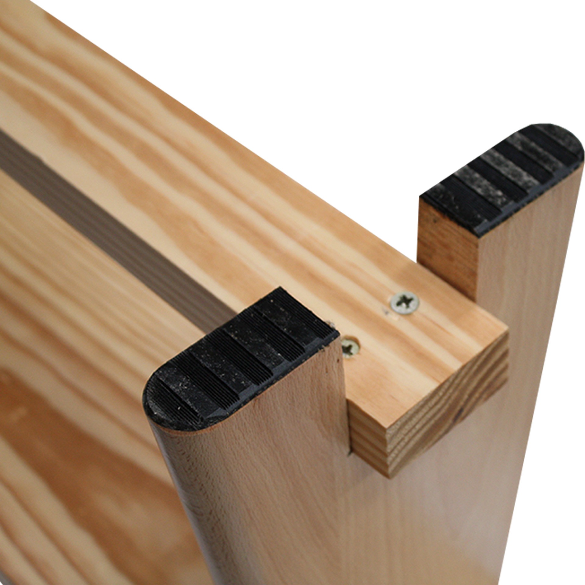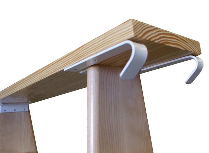 Está provisto de refuerzos metálicos entre patas, de gancho metálico para sujeción a espaldera y de tacos de goma antideslizante en cada una de las patas.