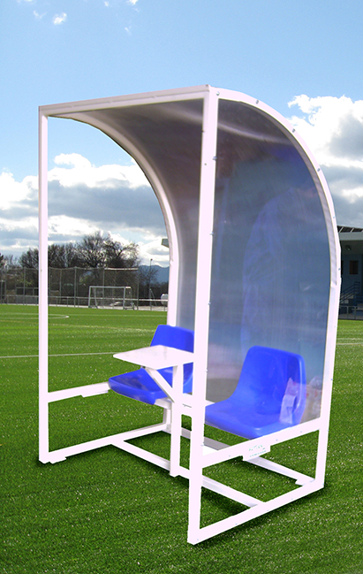 Banquillos fabricados en una sola pieza, con un perfil metálico pregalvanizado y lacado con pintura poliéster de 40x40x2mm, laterales en policarbonato compacto de 3mm y recubierto posterior y superior mediante planchas de policarbonato celular de 10mm.