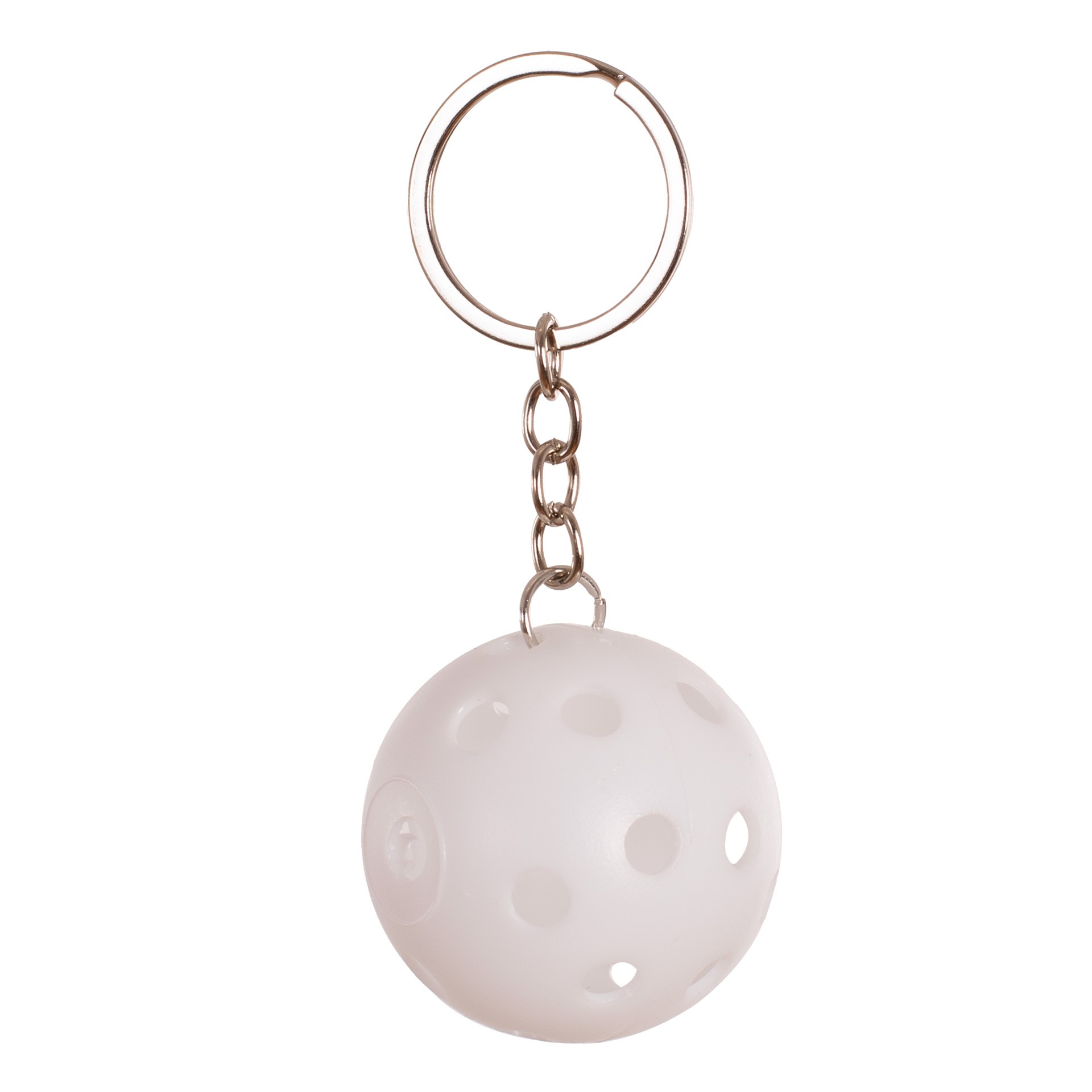 Llavero con forma de pelota de pickleball. Largo total del llavero: 9cm. Diámetro aprox de la pelota: 4cm.